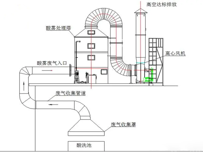 廢氣由風管吸入,自下而上穿過填料層循環吸收濟由塔頂通過液體分布器,均勻地噴到填料層中,沿著填料層表面向下流動,進入循環水箱.由于上升氣體和下降吸收濟在填料中不斷接觸,上升氣流中流質的濃度愈來愈低,到塔頂達到排放要求。