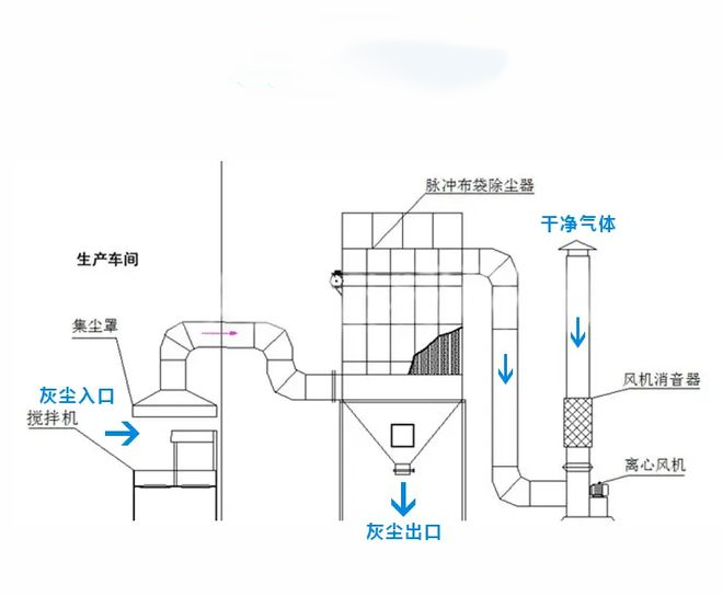布袋除塵器主要由上部箱體、中部箱體、下部箱體(灰斗)、清灰系統和排灰機構等部分組成。布袋除塵器性能的好壞,除了正確選擇濾袋材料外,清灰系統對布袋除塵器起著決定性的作用。為此,清灰方法是區分布袋除塵器的特性之一,也是布袋除塵器運行中重要的一環。