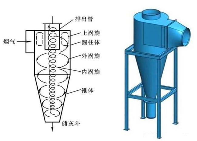 含塵氣體從進口處切向進入,氣流在獲得旋轉(zhuǎn)運動的同時,氣流上、下分開形成雙旋蝸運動,粉塵在雙旋蝸分界處產(chǎn)生強烈的分離作用,較粗的粉塵顆粒隨下旋蝸氣流分離至外壁,其中部分粉塵由旁路分離室中部洞口引出,余下的粉塵由向下氣流帶人灰斗。上旋蝸氣流對細顆粒粉塵有聚集作用,從而提高除塵效率。這部分較細的粉塵顆粒,由上旋蝸氣流帶向上部,在頂蓋下形成強烈旋轉(zhuǎn)的上粉塵環(huán),并與上旋蝸氣流一起進入旁路分離室上部洞口,經(jīng)回風口引入錐體內(nèi)與內(nèi)部氣流匯合,凈化后的氣體由排氣管排出,分離出的粉塵進入料斗。